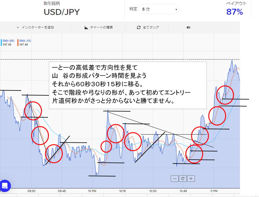 分殺エントリー チャートの本体部分にシンクロさせるエントリー方式 最初に一般チャートを見ます。 何かかしらのブレイク、または、平均線のパーフェクトオーダー ボリンジャーバンドのバンドウォーク待ちます。 これは2分連続の可能性の高い相場を待つということです。陽陽 陰陰となりそうな感じじゃないと勝てないからです。 不利なロウソク(でかすぎる物・順行の長いヒゲ)なら次はパスします。 ![]() ここでは押し目からの戻りの次を1分エントリーと3分のダブルエントリーをします。 トレンドの流れの手法なので、エリオット波動があり、二番目の山までにします。または前回トレンドが見えている時は、全戻しとして開始地点の80%までにします。 考え方はいろいろあってこの場合は上昇なので陽線出現率が高いので陽線が出たら次の1分をエントリー 陰線の場合は、休みできちんと00秒かマイナス100秒エントリーします。 ![]() ![]() 00秒で毎分エントリーします。 臨機応変 チャートは15秒、30秒、60秒3分、5分だけではないので、HIGHLOWでもいいので下記の秒殺エントリーのシナリオ つまりジグザグ、階段・弓なりゲレンデの形が出たらそこでそのエントリー HIGHLOWでもいいです綺麗なジグザグでエッジでエントリーできます。 ![]() タイミングエントリー ![]() 3分・60秒・30秒では綺麗なジグザグ・階段・弓なりゲレンデの形が見えなかった。よって15秒を選択 赤矢印がエントリー2秒遅れたら命取りでここからは、ボハイローボタンの上にマウスをもってきて集中 一トレンドで2勝したら止めましょう。 ![]() 相場には波があります。 おいしい波・おいしそうに見える波・まずい波・痛い波 バイナリは高いか安いかを決めるので、方向性を含めた波動パターンで決まります。 15秒や30秒と1分 3分5分とではそれぞれ勝ちパターンが違います。しかしその時間時間で最適な流れが必要です。 いきなり15秒や30秒でバンバン勝ちまくりーーというYOUTUBEをたくさん見ますが、確かに手法は素晴らしいと思います。 基礎を学んでやるのは良いが基礎がないと追いかけて反発をくらい、負けます。 勝てそうな相場は向かって言っても変わってはくれませんので待っているしかなくまるでスナイパーの様です。 全体の波動認識 水平線ブレイクが起きるとNИブレイクが起きてくるもんです。 全体のチャートを見て上層、中層、下層に分類する。上位の15分足・5分足でなんとなくで良いので観察 1分足を見て方向性を見ます。 天井・底になるとレンジがでます。 これはもう限界だよと思って控える人や利食いする人 もうちょっとなら行けると思う人 が交差するから 通常のトレンドでも同じようなことが起きるが、 一部の人の現象で限定的 これを押し目とそこからの戻り順行 戻り目とそこから戻りの順行 ここを狙う人は勝率もよく負けない 確かに天井や底で狙って当たれば大きいが、その部分は不安定で悩むことが大きく体に良くない 多少の押し目戻り目があるが、中層こそトレンドが勝利の相場でお薦めします。 バイナリでは、人それぞれなんですがうまい人ほど危険な場所ではエントリーしないもんです。 なお相場は常に動いていますので、層はその時その時で変わるので大きなトレンドが終わったら一旦上位足でチェックしてみてください。 全体的に上昇方向なら、天井圏でレンジ揉み合いになってさらに上に行くこともあるんだと分かるはず トレンドラインも引いてください。 ずうっと1分足では見ない。1時間に一回位チェックしましょう。 ![]() 全体を見ろと教科書に書いてあります。確かに見ますが、意識しないと価格の上限下限と上がってるか下がっているかくらいしか分からないです。 漠然とみてはいけません。 トレンド探しは水平線で トレンド発生は、天井や底付近 少なくも1日分は見てください。 水平線を当てて反発するところを探します。この時はトレンドラインはあってもなくも良いです。 自分のエントリースタイルは、最初は1つに決めてください。うまくなれたらそれでも2通りです。 それ以上はインジケーターなどプログラム化すればいいですが相当な勉強が必要で勉強中はトレードできないでしょう。プログラマー スタイルによっては、そこが逆張りのバイナリチャンスとなるし、順張りの方は、肩抜けまで我慢してトレンドがでるのを待ちます。 以後押し目からの順行を狙います この水平線の引き方がセンスでこれで勝負は決まったようなもんだと思うくらいです。 よく環境認識と言われ、水平線をうまく当てるのが決まっていなくセンスです。 他の参加者の動向を読む。今は勝てそうなのか、だめならどののようにダメか自分で考えましょう。 終わったチャートもおよその波動は見て水平線を引いてください。 ただ待つんじゃなく漠然でいいので予測期待して待つことが大事です。 逆張りだろうが順張りだろうが、勝てる場所は方向性のある場所となり長くなればトレンドです。誰がみてもわかります