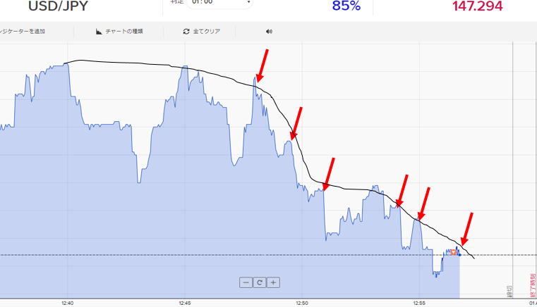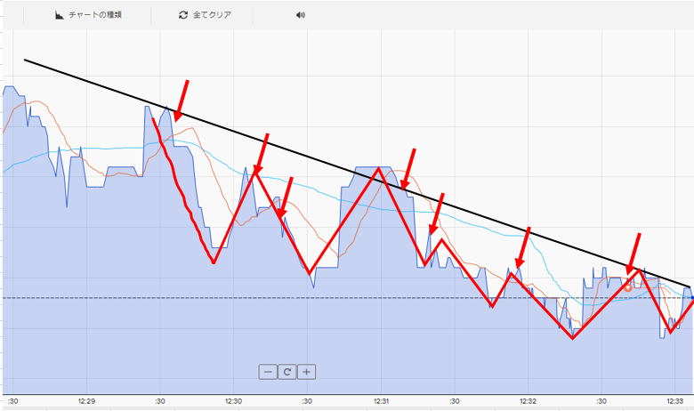 パターンの山谷が、ある程度の幅があります。。往復30秒以上でないとエントリーできません。 全戻しの山が、1分以上になれば高確率で狙えます。 ゼブラ相場によくあるパターンです。。 剣山のように細かいならエントリーしません。ハリネズミのように1分の山なら15秒エントリー トレンドが形成されていれば、パターン幅を見て、1分や3分エントリーできます。 ライントレードです。天井や底でエントリーします。タッチでエントリーするより 逆方向になった瞬間にパターン幅以下の時間のエントリーをします。 1分に一回勝てばいい。追いかけないで、判定時間で逆行して 角度が水平な時は、ピークエントリーします。 ピークエントリーはムズイずれたり約定拒否でついつい出遅れエントリーで負けることもあります。 ピークになって即エントリーしても、まず間に合わないです。よってピュンと行った瞬間逆エントリー 練習が必要 トレンド方向で、上か下かでエントリーが決まります。 トレンドが合っても、つられてピークでエントリーすると負けることが多く、 タイミングが悪いといざやってもやっても負けることもあるります。 また横滑りの混在する場所は、反発後斜め相場で1分3分でエントリーすると良いが、エントリーは2分で一回程度にします。 初心者は最初は見ているだけが良いです。 図では右は勢いがあるので勝てますが、センターは、訓練するのに良い場所です。 エントリーの終結時間は、その時その時違います。パターンをよく見るしかないです。 |