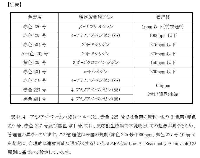 | 赤色220号 | βナフチルアミン | 1ppm以下 | |||||||||||||||||||||||||||||||||||||||||||||||||||||||||||||||||||||||||||||||||||||||||||||||||||||||||||||||||||||||||||||||||||||||||||||