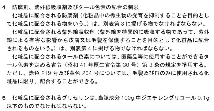 最初の原文 医薬品等に使用することができるタール色素を定める省令 (医薬品用タール色素) 第一条 薬事法(以下「法」という。)第五十六条第八号に規定する厚生労働省令で定めるター 一 外用医薬品以外の医薬品 別表第一部に規定するタール色素 2 前項に規定する規格に適合するかどうかの判定は、別表第四部に定める方法によつて行う (医薬部外品用タール色素) (平一二厚令一二七・平一六厚労令一一二・一部改正) (化粧品用タール色素) 2 前項に規定する規格に適合するかどうかの判定については、第一条第二項の規定を準用す 規格 略 第二部 規格 略 第三部 第四部 |