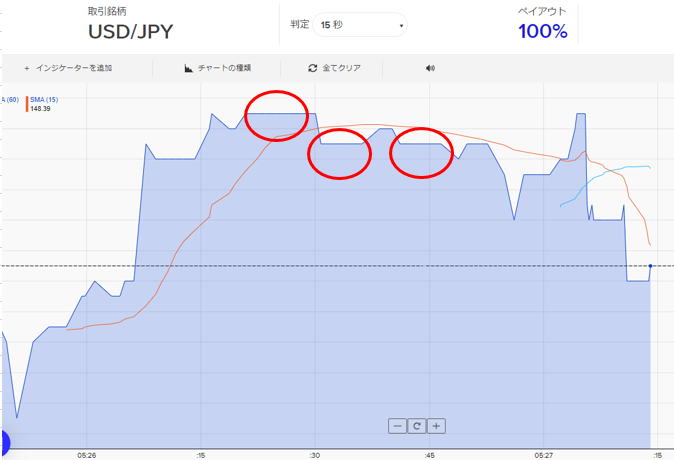 一般チャート | 必ず一般チャートも表示してください。 バイナリのラインチャートは細かすぎで流れを把握できない事があります。 ラインチャートを見てこれは上昇かと思うと、突然下降になったりします。 しかしトレンド内にあればまた順行するものです。 |