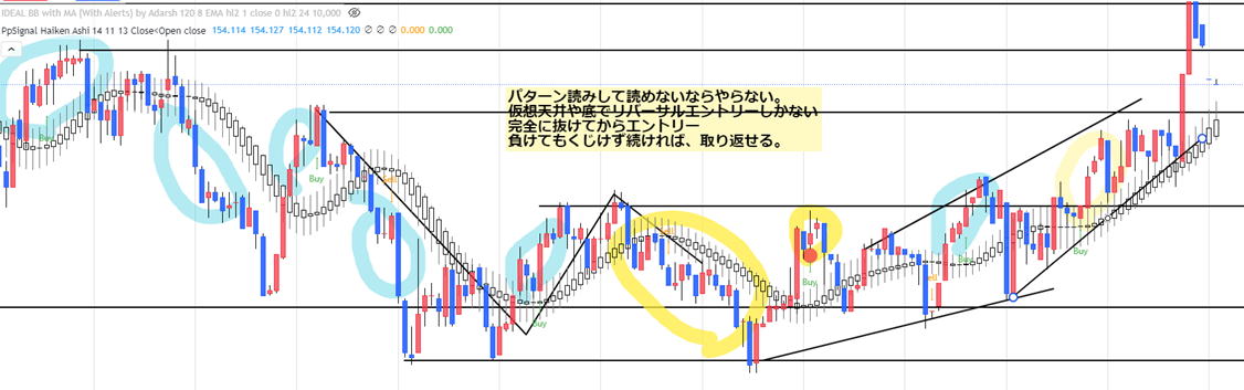| 以下の相場は緩やかな相場で 20240229の午後です午前と同じような3本レンジトレンドの長いやつです。 ![]() MACDは一部しか使っていなかったのでエントリーポイントや勝率は書きませんが レンジトレンドの反発は、3分が多いです。棚がずれていくような棚田風景。落ちてからじゃ5分エントリーするって言ったら全部負けちゃうって感じです。 パターンを読み切るかが勝敗の分から目です。 20240227昼から レンジのトレンドです。下げです。 以下の相場は緩やかな相場でMACDは、バカになります。 ずれちゃってピラミッドのピークとろうそくのピークが同じで 0基準エントリーしたら5分負ける。そもそも3分レンジなので5分では、勝つってありない そうか、1分や3分ならものすごく勝てるんだます 3本トレンドレンジの手法 レンジトレンドでは独特の打ち方をします 3分バイナリとします。 環境認識 MACDがちょっと狂ってきます。よってMACDは使わないです ロウソクのピークにプライスアクションが出て下がれば売りエントリーします。Highはやりません 具体的な方法は、前回のトレンドに水平線を引きます。ヘッド・肩・ボトムです。ここでは、MACDは使わないようして 3分バイナリでやります。 基礎中の基礎 手法 ①ダウ水平線ブレイクエントリー ⓶5MAブレイク手法 水平線がすぐに引けない時は、5MAブレイクでやっても良いです。 MACDは使わないので記載有りません。 右から3番目だけ負けです 仕方ないかな一個漏れで 8戦7勝でまあまあ 信号の次の足でエントリーします。 ①の信号と重なっています。 ③MACDの団子・おせんべいの見切り発車手法 ある程度、ロウソクのパターンが決まり出したら出動します。 ピラミッドがの復路の坂がなで肩で戻るのを見ます。 そこで棒が、団子かおせんべいになっていて、すでにロウソクの反発があったのを確認してエントリーします。 0基準まで待って、やってたんじゃ、エントリーは遅いです。間に合いません。遅いと間に合いません。 このギアの雰囲気を覚えるだけで相当勝てます。 どうしてもMACDならピークからワンダウンの場所です。 めんどくさくないMACDの製品ピラミッドセンター落ち狙い 5MAなら抜けもチャートをいじらないでOk 水平線は書くので面倒ですが、本元のチャートなので本来のトレードスタイルでやってください。 アンダータスクバーを上に1分3分5分と選べるようにしておいてください。 この相場ではMACD信号後5分5 勝率は少し悪いが、60%以上なら利益が出ます。検証で様々なパターンを思えると良いです。 ブレをビビらずやった方が良いという結果でした。 1本ロウソクレンジでは、カウンタクロスの時しか取引しません。 |